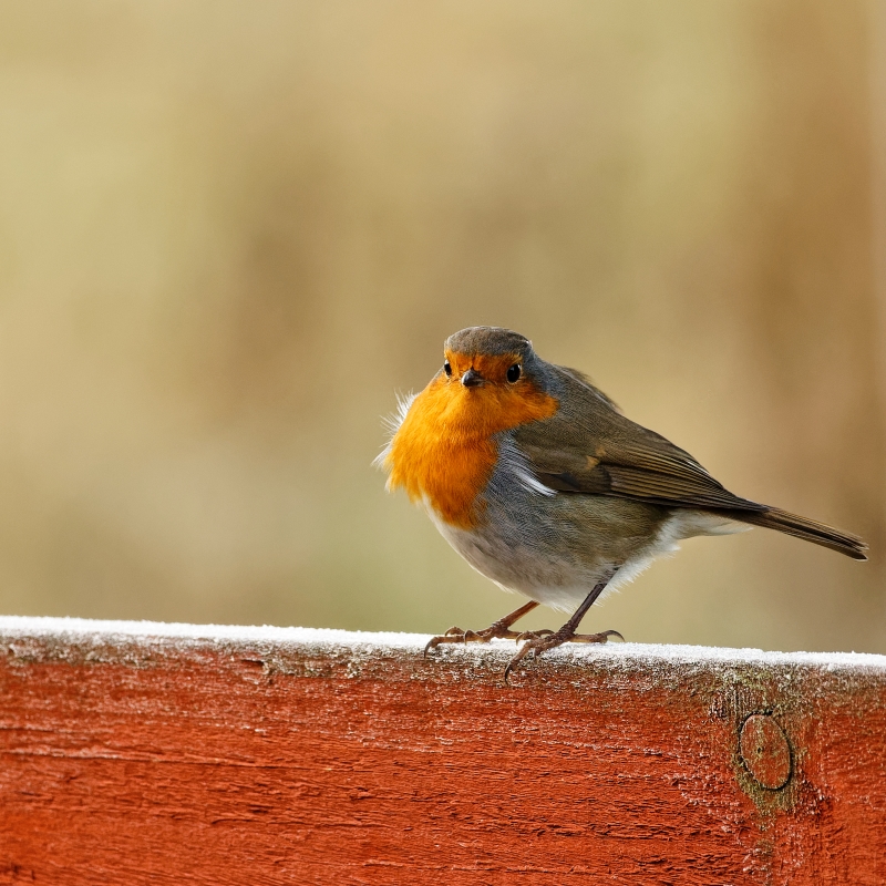 Next year's Christmas card? Good to isolate the robin from the background, helped by the sprinkling of snow, and very obliging of the robin to sit on a red fence.