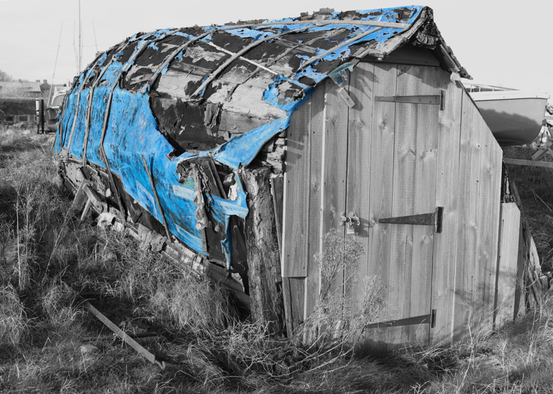 Image turned to Greyscale, but then adding the Blue of the ripped sheeting back into the shot as a focal point.